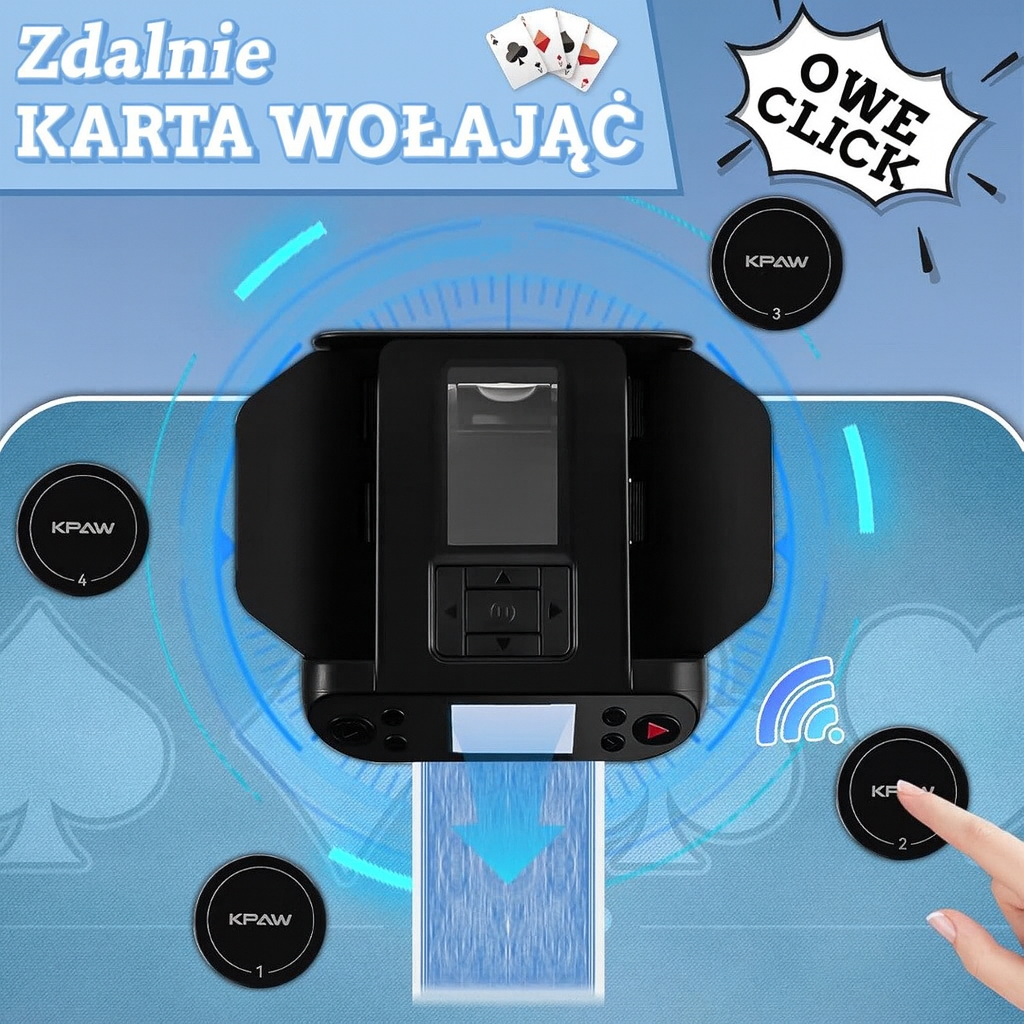 W zestawie 4 bezprzewodowe piloty – każdy gracz może dobrać kartę jednym kliknięciem, bez przerywania rozgrywki i wstawania od stołu.
